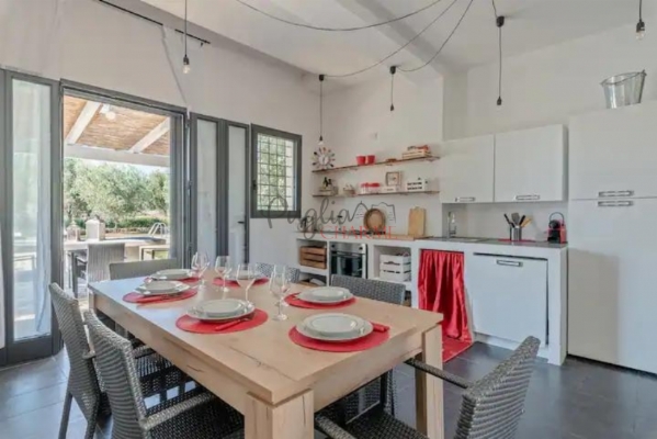 Vendedi in agro di Ostuni, bella villa composta da quattro camere da letto, due bagni, zona living con cucina .Veranda esterna, piscinaTerreno di circa 9.000 coltivato ad ulivo e bel giardino curato.La villa è posizionata in una zona tranquilla e riservata, ideale sia per residenza privata che per attività di casa vacanza.