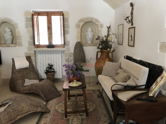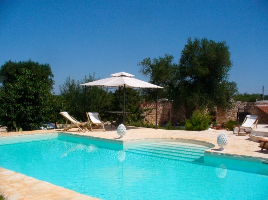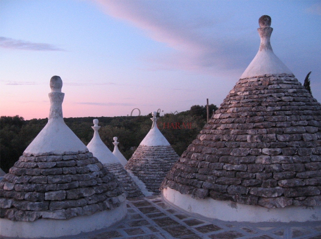 Vendesi in agro di Ceglie Messapica, magnifico complesso di trulli, circondata da circa 17.000 mq di campagna mediterranea con ulivi, ciliegi e lecci. La struttura è composta da quattro unità abitative: la Lamia, antica stalla, il Trullo Sovrano, un grande trullo in pietra con adiacenti piccole alcove con coni, il Trulletto tre coni in pietra e la Lamietta, ex cisterna. La Lamia è il cuore della casa, appartamento dei proprietari che in alcuni casi concedono a folti gruppi famigliari che vogliono riunirsi per trascorrere insieme momenti di relax come le vacanze. E’ composta da una camera con letto matrimoniale, bagno, cucina, zona living ( pronta ad accogliere le vostre colazioni nei giorni più rigidi ) suddivisa in zona pranzo e zona camino/relax con divano letto. All’esterno dispone di un patio coperto dove gli ospiti durante la prima colazione, nelle calde giornate d’estate, possono godere dell’atmosfera caratteristica del territorio. Il Trullo Sovrano è un appartamento con due camere da letto matrimoniali, due bagni di cui uno all’interno di una camera da letto e alcove con 2/4 posti letto. L’appartamento non dispone di una cucina ma di un angolo attrezzato di piastra elettrica, mini frigo e fornetto per l’autonomia della prima colazione. All’esterno un gazebo con tavolo e sedie dove poter soggiornare all’aperto. La Lamietta, una vecchia cisterna recuperata rispettando la sua origine, è dotata di anticamera, camera con letto matrimoniale o all’uopo due letti singoli e bagno. Si affaccia sul piazzale principale della struttura. A disposizione degli ospiti ci sono gli spazi comuni: la lavanderia, la terrazza panoramica, il piazzale d’ingresso, il solarium, la piscina ed infine un parcheggio privato. La piscina 5 x 10 caratterizzata da un’altezza costante di mt. 1,20 permette anche ai più piccoli di divertirsi senza pericolo, possiede un’elegante scala romana che permette l’ingresso dolce e graduale. Un ampio solarium è a piena disposizione di chi ama godere del caldo sole del Sud. Il patio è lo spazio dedicato alla prima colazione. Rivolto a sud ma protetto da una tettoia si affaccia sulla magica campagna mediterranea che circonda la casa e regala momenti di fresco relax nei caldi pomeriggi d’estate. Permette inoltre, di trascorrere deliziose serate gustando appetitose cene a base di specialità alla griglia in compagnia di amici. Il complesso di trulli è un’oasi di pace al centro della Valle d’Itria, dove il profumo dei fiori, i colori della terra, rendono la struttura unica ed incantevole.