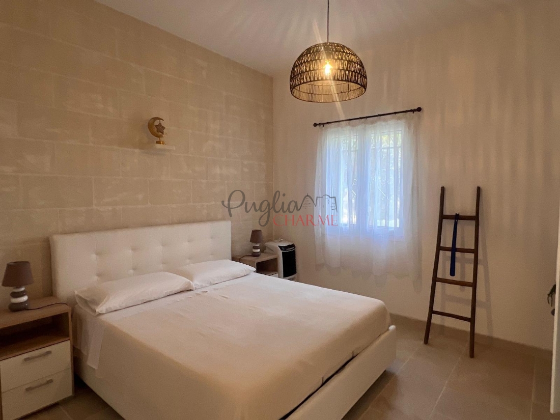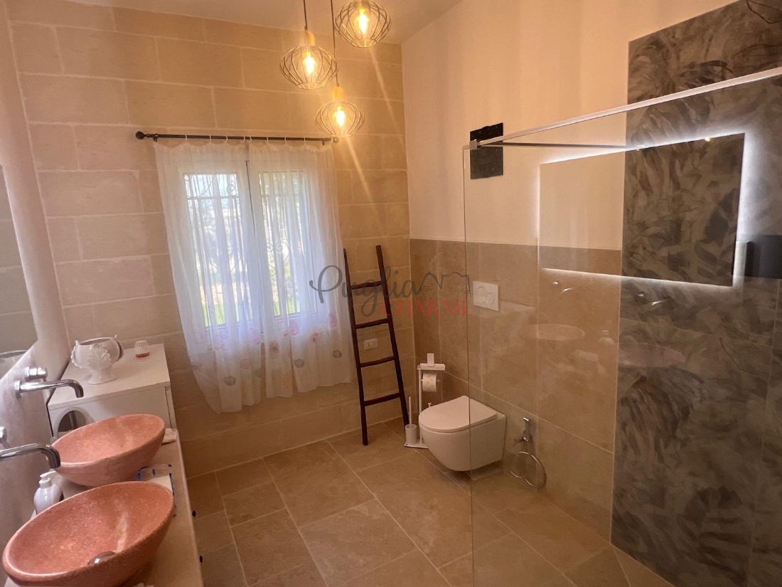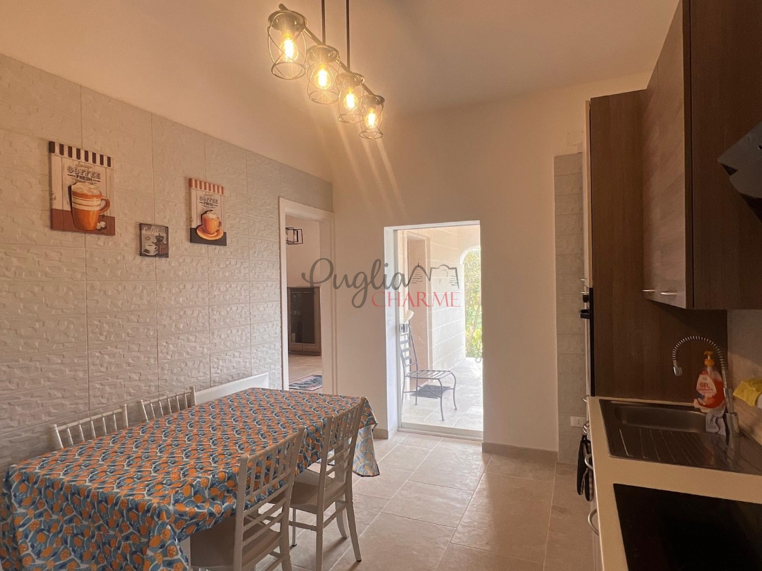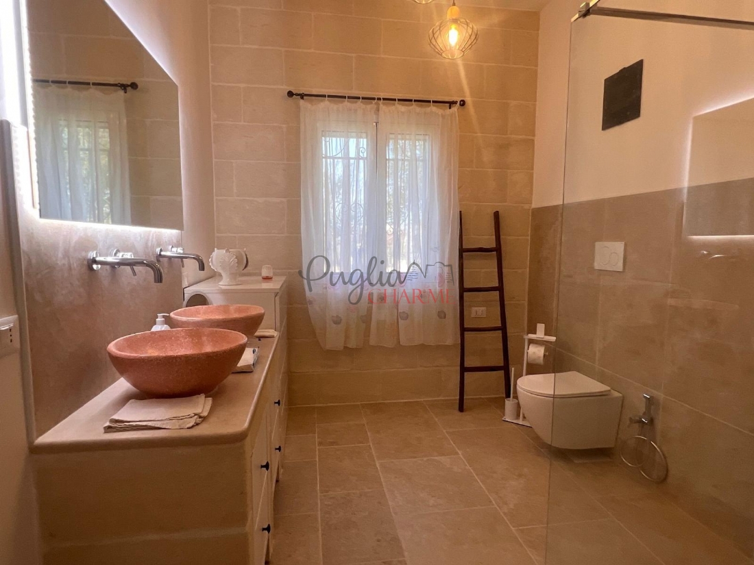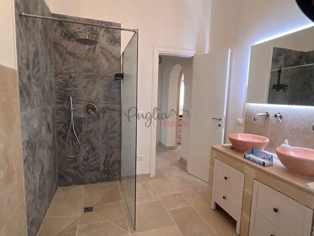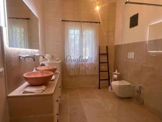 Vendesi in agro di Ostuni, bellissima villa ristrutturata finemente e di gran gusto.La villa è composta da ampia zona living con parete di tufo faccia a vista, cucina abitabile con camino, due camere da letto luminose e due bagni di cui uno padronale con doccia walk-in.Locale tecnico esternamente.Dalla porta a vetri della cucina, si accede alla veranda funzionale ideale per vivere le giornate estive all’aperto.Il terreno è di circa 4.400 mq recintato, coltivato ad uliveto, frutteto ossia: gelso bianco, melograno, fichi, agrumi, nespole, mandarino, prugna.La villa è dotata di zanzariere, inferriate, porta blindata, cancello automatico, impianto fotovoltaico con accumulatore, cisterna per l’acqua, acquedotto rurale con contatore di sottrazione, predisposizione all’allarme, le telecamere, predisposizione per la stufa a pellet.Si possono mettere i termosifoni elettrici in quanto ci sono i pannelli solari.La villa è rialzata ed è molto importante per non avere l’umidità.È possibile realizzare una piscina di massimo 40 mqPer la sua bellezza e funzionalità, la villa è ideale sua per residenza privata che per casa vacanza.